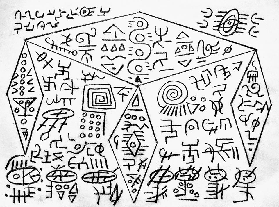 Символическое изображение Солнца, различных объектов: Треугольных космических кораблей, крест - анкх, нейтронной звезды (точка в круге), символы перемещения в пространстве. Числа.