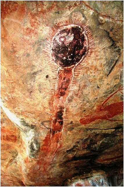Видение 1. «На звездном небе появился какой–то быстро вращающийся небесный объект черно – красного цвета. Он похож на звезду (точка в круге) окутанную темным газопылевым облаком. Позади её длинный извивающийся шлейф. Этот объект стремительно приближается к Земле. На нашей планете начинаются землетрясения, цунами. Началось извержения вулканов с выбросом вулканического пепла и газов. При максимальном сближении с Землей ее атмосфера стала похожа на бублик, который вытянут в сторону звезды, а затем нашу планету крутануло вокруг своей оси, она перевернулась, а потом вернулась в прежнее положение, но со смещением оси своего вращения. В это же время к звезде потянулся столб, захваченной ее тяготением, земной атмосферы, воды и почвы. На фоне этого столба появились многочисленные светящиеся силуэты людей. Огромные приливные волны высотой сотни метров обрушились на материки, сметая все на своем пути. Приливная волна возникла во всех водоемах: морях, озерах и реках. Затем Землю затянуло каким–то темным туманом.
